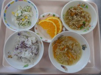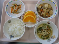 すき焼き風煮 キャベツのゆかり和え オクラスープ ごはん オレンジ |