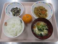 焼きそば 大豆とひじきのサラダ 青菜のみそかき玉汁 ごはん みかん |