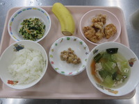 鶏肉のからあげ 千切大根のごま酢和え ワンタンス-プ ごはん バナナ |