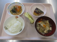 焼き鯖 かぼちゃのそぼろ煮 のっぺい汁 ごはん りんご |