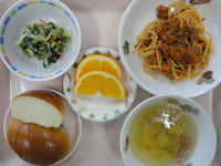 ミートスパゲティ 小松菜サラダ 玉ねぎとベーコンのスープ バターロール オレンジ |
