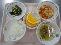 ポークビーンズ 青菜とコーンのごま和え わかめスープ ごはん オレンジ |