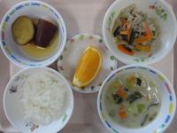 野菜たっぷり豚肉の生姜焼き さつま芋の甘煮 白菜のクリーム煮 ごはん いよかん |