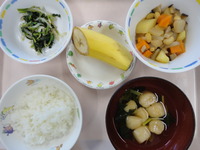 かぼちゃのそぼろ煮 きゃべつとコーンの中華和え 冷たいすまし汁(かまぼこ) ツナカレーピラフ 巨峰 |