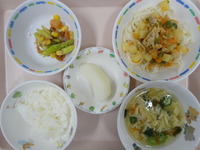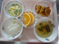餃子のあんかけ スパゲティサラダ わかめスープ(玉ねぎ、コーン) ごはん オレンジ |
