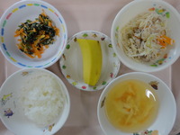 焼きビーフン 小松菜とにんじんのごま和え コーン卵スープ ごはん バナナ |