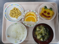 白身フライ 大豆煮豆 スティックきゅうり 味噌汁(えのき) ごはん オレンジ |