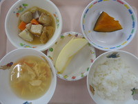 厚揚げと野菜のとろみ煮 かぼちゃ煮 コーン卵スープ ごはん りんご |