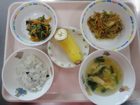 焼きそば 三色ナムル かき玉スープ わかめごはん バナナ |