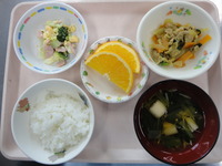 | フルーツヨーグルト | 豚肉カレー炒め ブロッコリーと卵のサラダ 麩のすまし汁 ごはん オレンジ |