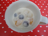 | フルーツヨーグルト | そぼろおにぎり 串団子 スティックきゅうり そうめん オレンジ |
