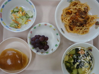 ロールパン ナポリタン コールスローサラダ 洋風かきたま汁 ぶどう |
