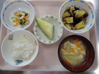 ごはん じゃがいものひじき煮 小松菜サラダ みそ汁 メロン |