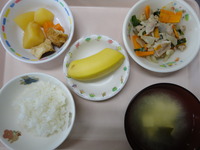 ごはん 野菜たっぷり豚肉の生姜焼き じゃがいもの含め煮 みそ汁 バナナ |