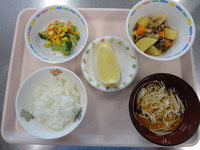 ごはん 牛肉とじゃが芋の煮物 ブロッコリーとコーンのゴマ和え そうめん汁 グレープフルーツ |