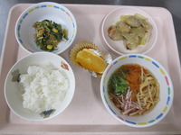 ハニ-スパイシ-チキン 青菜とコーンのごま和え 五目そうめん ごはん オレンジ |