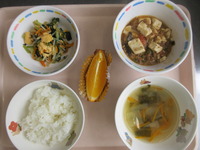 野菜たっぷり夏マ-ボ 小松菜の中華和え わかめスープ ごはん オレンジ |
