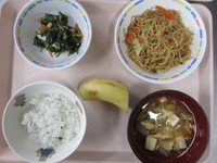 焼きそば ほうれん草とささみの酢和え かき玉汁 わかめごはん バナナ |