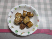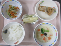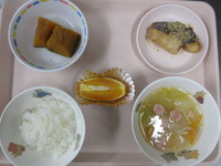 白身魚のごま照り焼き かぼちゃ煮 野菜とウインナーのスープ ごはん オレンジ |