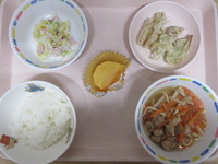 ちくわの磯辺揚げ 白菜サラダ 煮込みうどん ごはん 柿 |