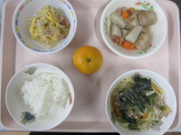 里芋と豚肉の煮物 冷ばん三すう 中華風ス-プ ごはん みかん |
