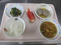 | わかめおにぎり | つくねのあんかけ ほうれん草とツナの和え物 和風カレ-うどん ごはん グレープフルーツ |