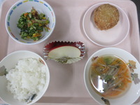 ミンチカツ ブロッコリ-とコーンのおかか和え わかめスープ ごはん りんご |