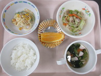 豚肉とキャベツのみそ炒め スパゲティサラダ すまし汁(小松菜) ごはん オレンジ |