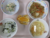 焼きそば 大豆とこんにゃくのサラダ コ-ン卵ス-プ 菜飯 オレンジ |