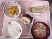 | 抹茶ホットケ-キ | ししゃもの天ぷら かぼちゃと卵のサラダ たぬき汁 ごはん りんご |