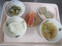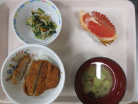 ソ-スかつ丼 小松菜とじゃこの和え物 みそ汁(さつまいも) グレープフルーツ |