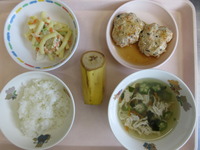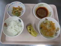 ハンバ-グソ-ス煮 キャベツのおかか和え コンソメスープ ごはん バナナ |