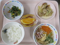 ハニ-スパイシ-チキン 青菜とコーンのごま和え 五目そうめん ごはん オレンジ |