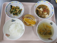 野菜タップリ夏マ-ボ 小松菜の中華和え わかめスープ ごはん オレンジ |