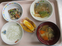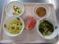 ミンチカツ さつま芋と梨のサラダ しめじとチンゲン菜のスープ ツナカレ-ピラフ グレ-プフル-ツ |