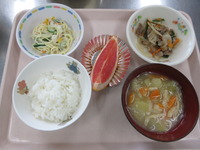 野菜たっぷり豚肉の生姜焼き スパゲッティサラダ キャベツのみそ汁 ごはん グレ-プフル-ツ |