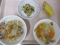 スタミナ中華丼 千切大根のごま酢和え 野菜のコロコロス-プ バナナ |