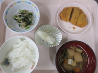 とんかつ 小松菜ともやしのお浸し 麩のすまし汁 ごはん 梨 |