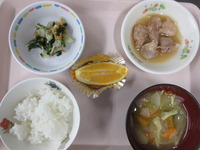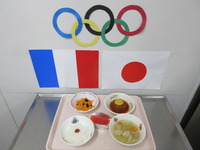 ≪オリンピック給食≫ 金メダルハンバ-グ キャロットラベ ポトスス-プ ごはん グレ-プフル-ツ |