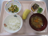 焼き鯖 スティックきゅうり 小松菜の中華和え はんぺんのすまし汁 ごはん バナナ |