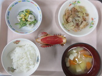 鶏のマーマレ-ド煮 キャベツとほうれん草の磯和え 五目みそ汁 ごはん オレンジ |