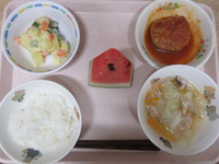 豆腐ハンバーグソ-ス煮 マセドアンサラダ キャベツのベーコンス-プ ごはん すいか |