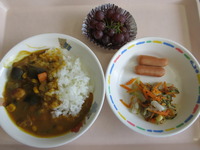 ウインナ- おくらのおかか和え 茹でとうもろこし 夏野菜カレー ぶどう |