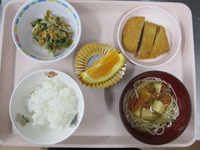 とんかつ 五目和え 卵豆腐の冷やし汁 ごはん オレンジ |