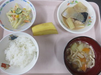 | ぽたぽたやき | さばのみそ煮 マカロニサラダ たぬき汁 ごはん バナナ |