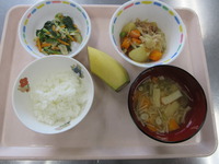 | にんじん蒸しパン | 肉じゃが ほうれん草の納豆和え はんぺんのすまし汁 ごはん バナナ |