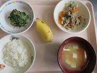 野菜たっぷり豚肉の生姜焼き ほうれん草ともやしのごま和え みそ汁(じゃが芋・玉ねぎ) ごはん バナナ |