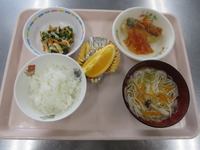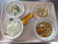 ちくわの磯辺揚げ 大豆とこんにゃくのサラダ 煮込みうどん ごはん オレンジ |