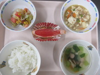 マ-ボ豆腐 キャベツとコーンの中華和え しめじとチンゲン菜のスープ ごはん グレ-プフル-ツ |