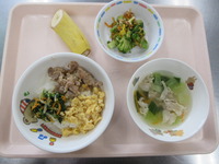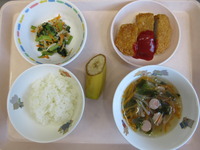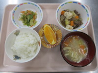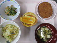コロッケ ほうれん草の納豆和え 若竹汁 さばカレ-ピラフ オレンジ |